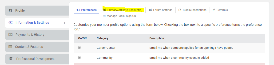 - Under the "Information & Settings" section, click "Primary/Affiliate Account(s)". Here, you may view and manage your Primary/Affiliate account(s).