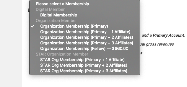 - Select the membership you would like – here is where you can switch to a Digital Membership, upgrade to a Star Organization Membership or add an Affiliate member.