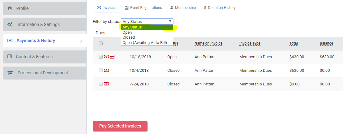 - This will take you to the “Payments & History” section of your profile. From here you will be able to download or print the invoice or pay online with a credit card.