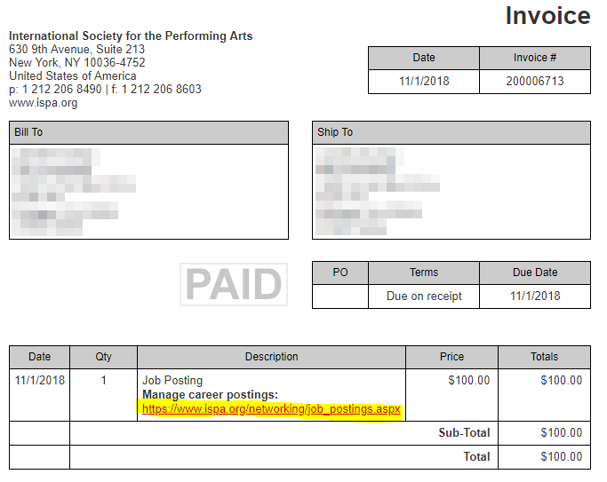 - Purchase a job announcement (Rate: $100 US per posting for 60 days). Upon completion of payment, you'll find a link to view the invoice. Click on "View Invoice/Receipt."